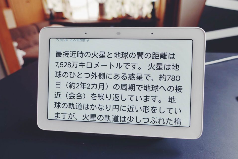 ちなみに音声検索が画面があると、非常に分かりやすくなる。まず自分の言ったことがリアルタイムで表示される。ここでは「火星までの距離は」